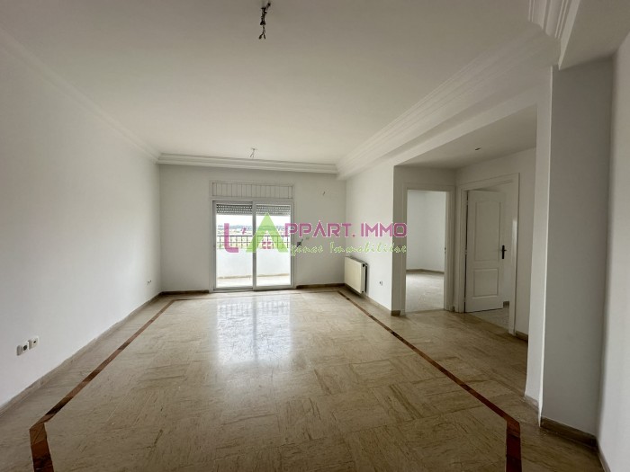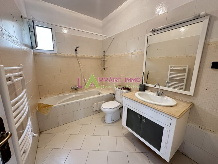 Cet appartement se situe dans une résidence gardée et propre à Ezzahra. Il se compose d'un salon avec un balcon, deux chambres à coucher dont une avec dressing partageant une salle de bain et une cuisine aménagée avec accès à un séchoir. Il est équipé par un chauffage central. Une place de parking est disponible.