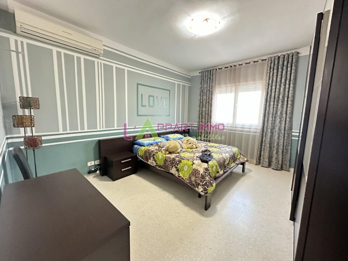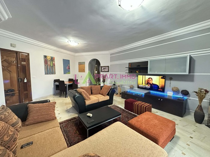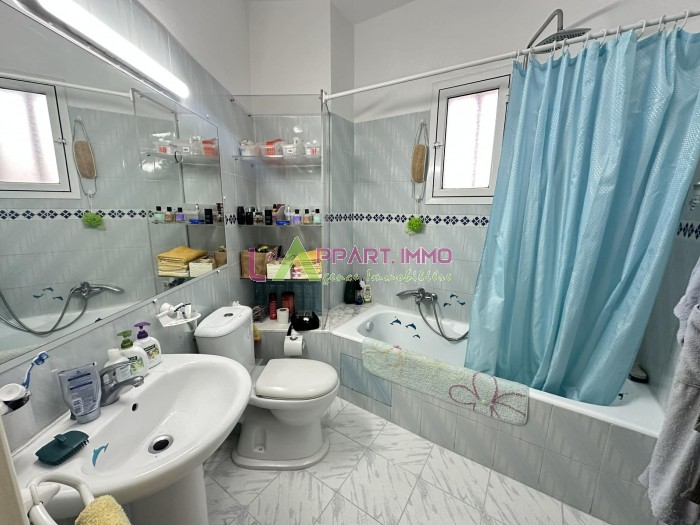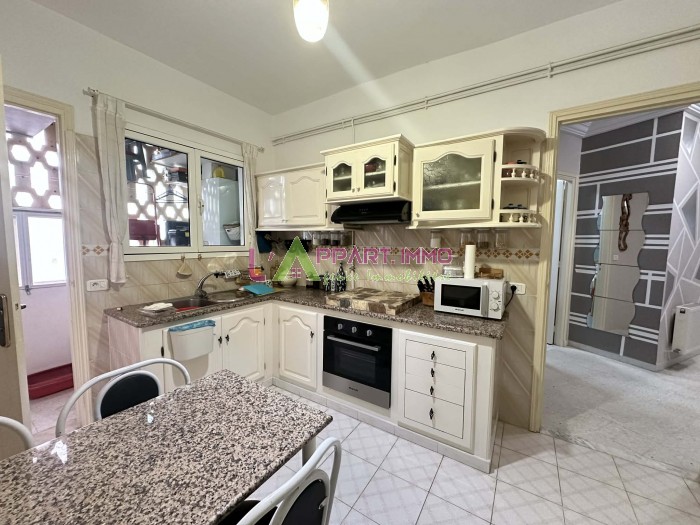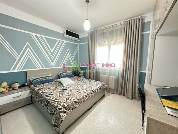 Cet appartement se situe dans une résidence gardée à Hammam chatt coté plage. Il se compose d'un salon avec un balcon, deux chambres à coucher partageant une salle de bain. Une cuisine aménagée et équipée avec accès à un séchoir et une salle d'eau est disponible pour les invités. Il est équipé par un chauffage central et deux climatiseurs. Une place de parking est disponible.