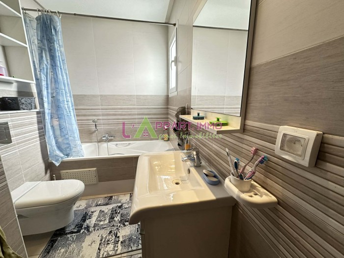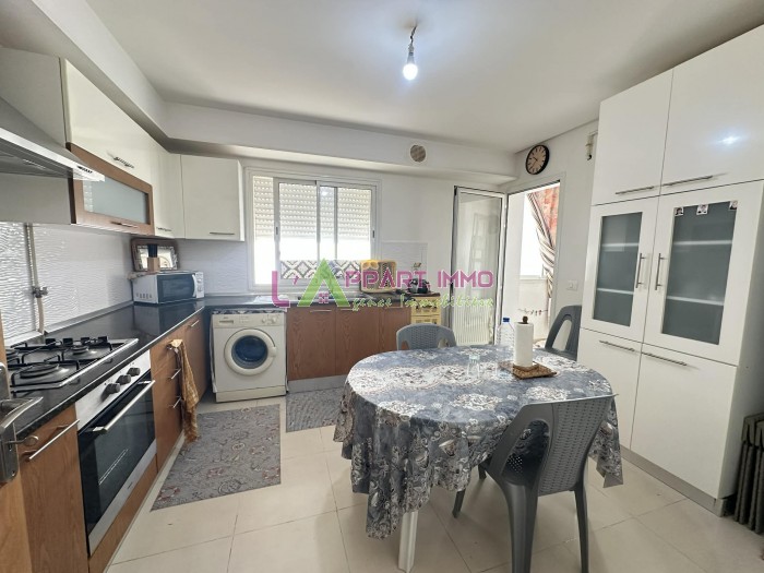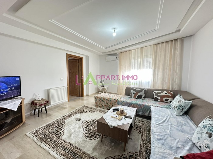 Cet appartement se situe dans une résidence gardée et propre à Boumhel coté monoprix. Il se compose d'un salon, deux chambres à coucher partageant une salle de bain. Une cuisine aménagée et équipée par plaque, hotte et four avec accès à un séchoir. Il est équipé par un chauffage central et un climatiseur. Une place de parking sous-sol est disponible.