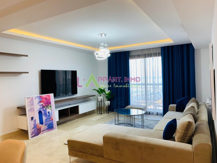 Cet appartement richement meublé de très haut standing se compose d'un salon-salle à manger avec un balcon qui donne sur la mer, deux chambres à coucher, une salle d'eau, une salle de bain, une cuisine bien aménagée et équipée et qui possède un accès à séchoir. Le chauffage et le climatiseur central sont disponibles.