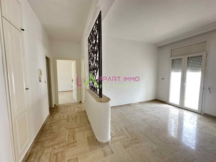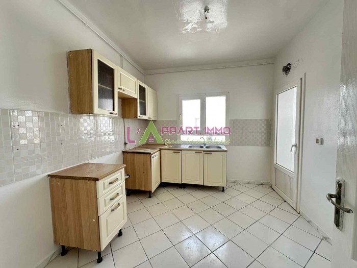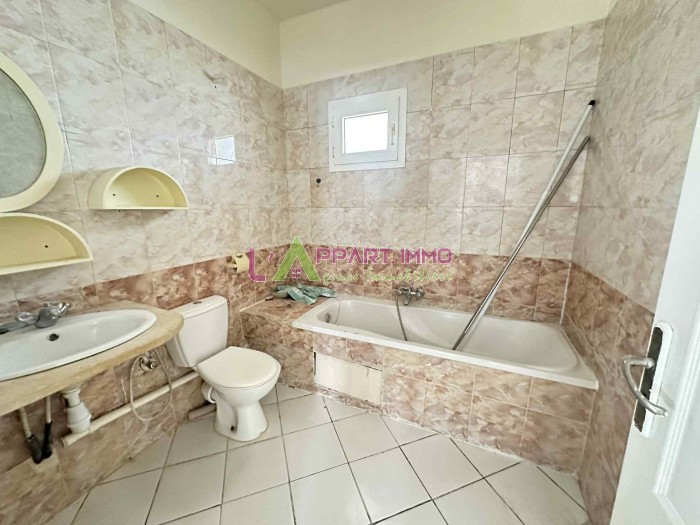 Cet appartement se situe dans une résidence propre et gardée à Rades Maxula. Il se compose d'un salon avec accès à un balcon, deux chambres à coucher dont une avec un grand placard partageant une salle de bain et une cuisine aménagée avec accès à un séchoir. Une place de parking est disponible.