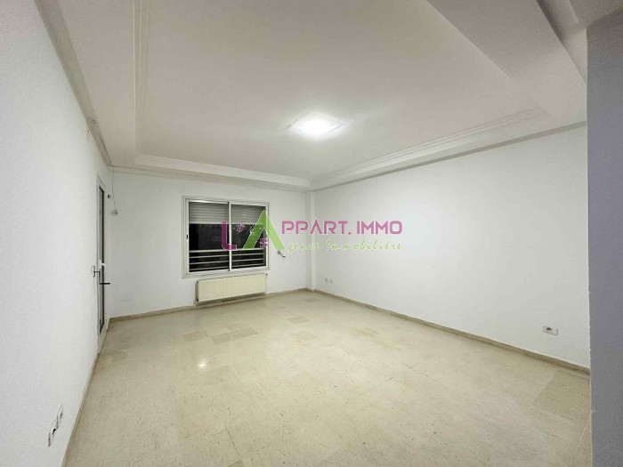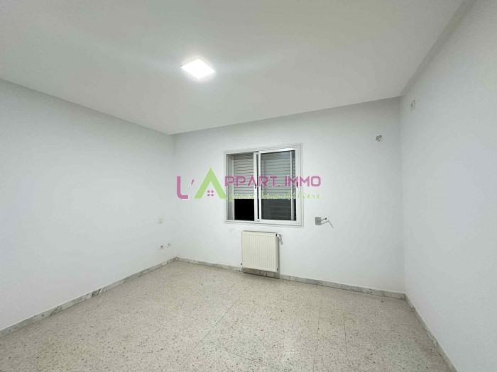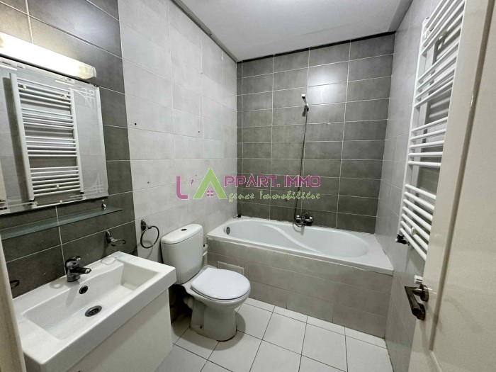 Cet appartement se situe dans une résidence gardée à Nouvelle Madina. Il se compose d'un salon avec un balcon, deux chambres à coucher partageant une salle de bain et une cuisine aménagée avec accès à un séchoir. Il est équipé par un chauffage central. Une place de parking sous-sol est disponible.
