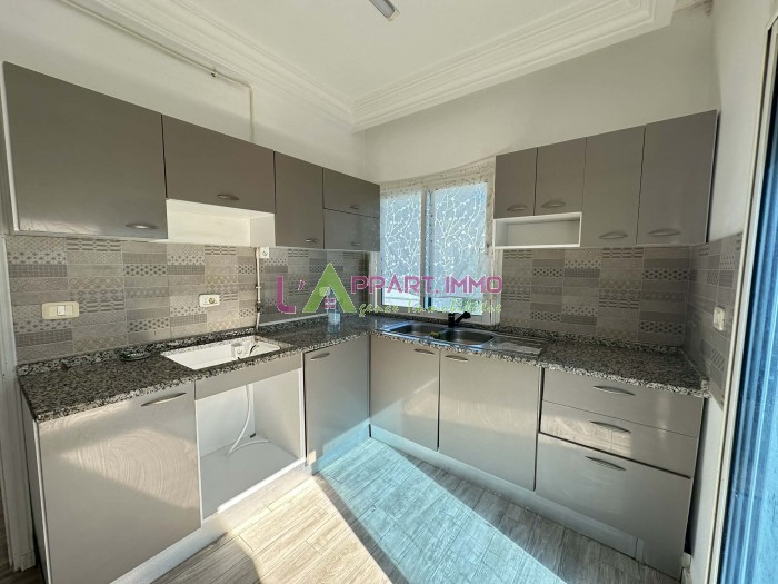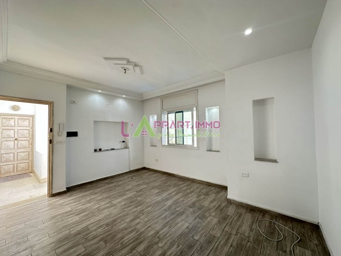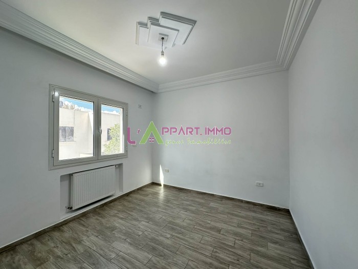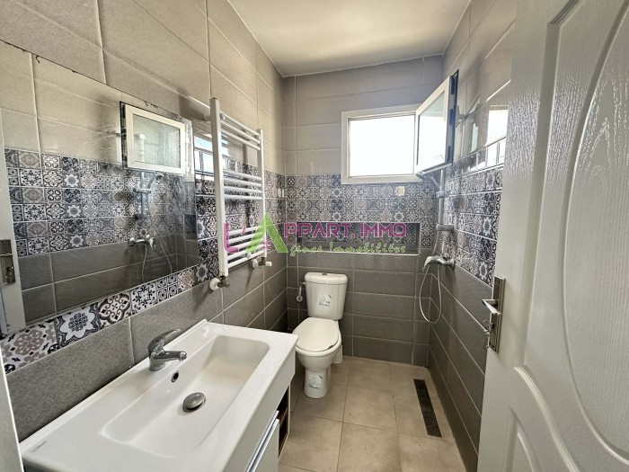 Cet étage de villa se situe dans un quartier calme à Boumhel. Il se compose d'un salon, deux chambres à coucher partageant une salle d'eau avec douche et une cuisine aménagée. Il est équipé par un chauffage central.