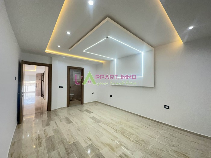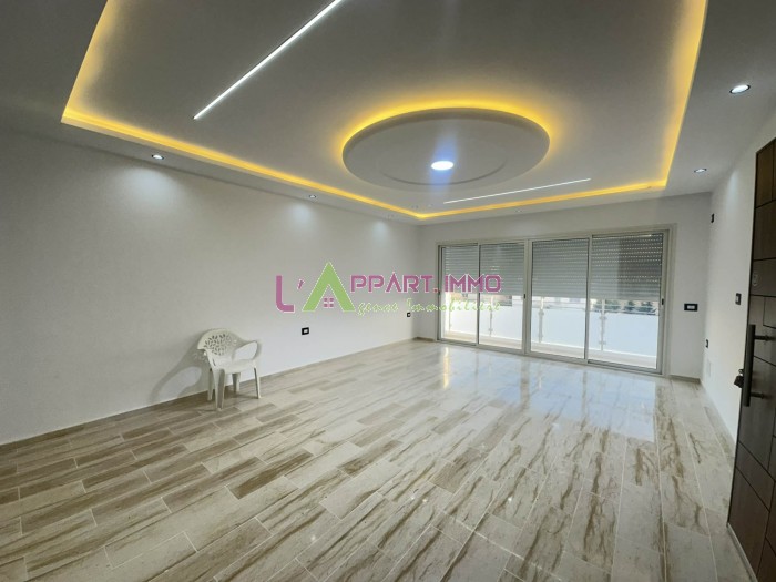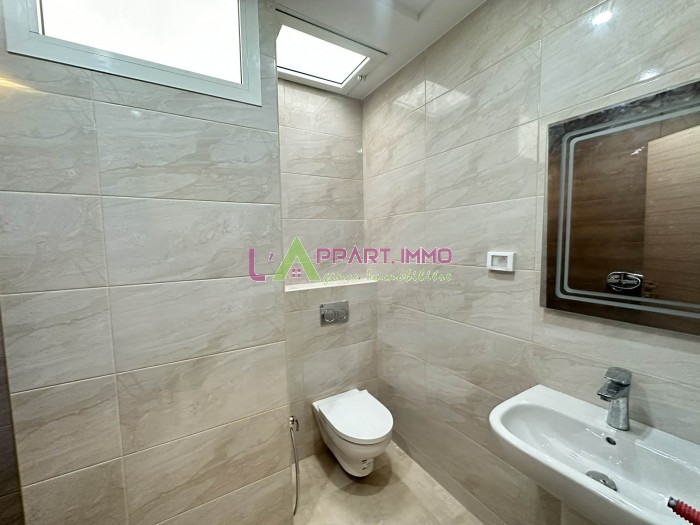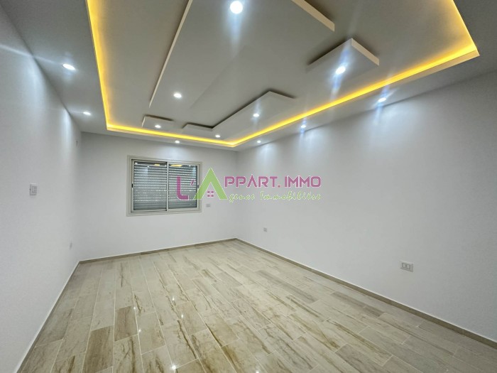 Cet étage de villa neuf se situe dans un quartier calme à Ezzahra route Rades. Il se compose d'un grand salon avec un balcon, trois chambres à coucher dont une suite parentale partageant une salle d'eau avec douche et une cuisine aménagée et équipée par une plaque et hotte. Il est équipé par un chauffage central.