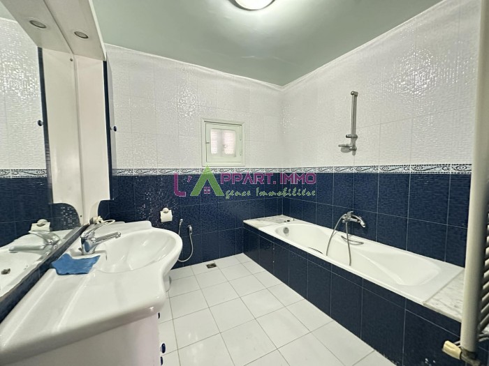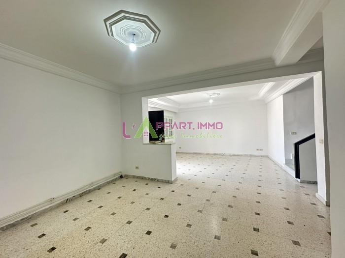 Ce duplex se situe dans un quartier calme et proche de toutes commodités à Rades Bir Taraz. Il se compose d'u salon grand salon ainsi que d'une salle à manger, une chambre et une cuisine aménagée avec des éléments de rangement et une salle d’eau avec douche est à disposition des invités. Des escaliers nous mènent à la partie nuit qui abrite deux chambres à coucher dont une avec dressing partageant une salle de bain. Il est équipé par chauffage central. Une grande terrasse est disponible.