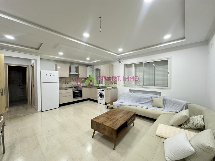 Cet appartement se situe dans une résidence récemment construite gardée et propre. Il se compose d'un salon et une chambre à coucher. Quant à la cuisine elle est ouverte sur le salon et elle est équipée et aménagée avec des éléments de rangements, plaque, hotte et une salle d'eau avec douche. Il est équipé par un chauffage central. Une place de parking est disponible.