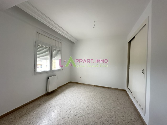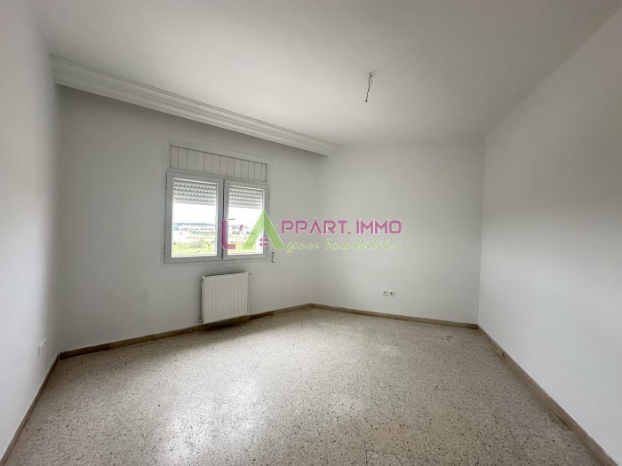 Cet appartement se situe dans une résidence gardée et propre à Ezzahra. Il se compose d'un salon avec un balcon, deux chambres à coucher dont une avec dressing partageant une salle de bain et une cuisine aménagée avec accès à un séchoir. Il est équipé par un chauffage central. Une place de parking est disponible.