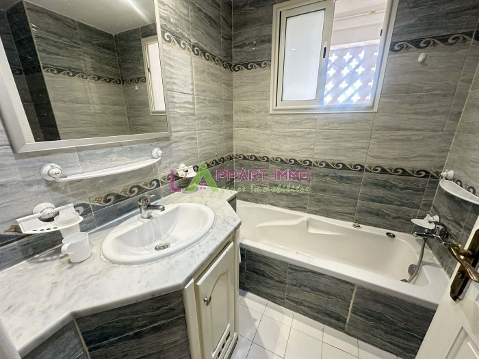 Cet appartement se situe dans une résidence gardée et propre à Mourouj 4. Il se compose d'un salon avec un balcon, trois chambres à coucher dont une avec dressing partageant une salle de bain. Une salle d'eau est disponible pour les invitées. Une cuisine aménagée avec accès à un séchoir. Il est équipé par un chauffage central et deux climatiseurs. Une place de parking est disponible.