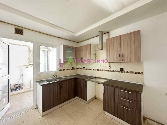 Cet appartement se situe dans une résidence gardée à Nouvelle Madina. Il se compose d'un salon avec un balcon, deux chambres à coucher partageant une salle de bain et une cuisine aménagée avec accès à un séchoir. Il est équipé par un chauffage central. Une place de parking sous-sol est disponible.