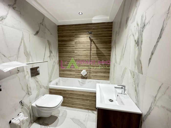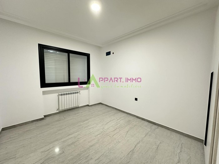 Cet appartement neuf se situe dans une résidence propre et gardée à Borj Cedria. Il se compose d'un salon, deux chambres à coucher avec dressing partageant une salle de bain et une cuisine aménagée et équipée par plaque hotte et plaque avec accès à un séchoir. Il est équipé par un chauffage central. Une place de parking est disponible. Prix le mètre carrée : 2500DT 3éme étage : Deux appartements S+2 : Superficie 103m2 4éme étage : Deux appartements S+2 : Superficie 98m² / 102m² et un appartement S+3 : Superficie 134m²
