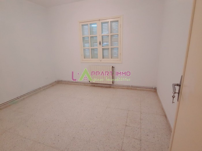 Cet appartement se situe dans une résidence gardée à Ezzahra. Il se compose d'un salon avec un balcon, trois chambres à coucher partageant une salle de bain et une cuisine aménagée qui s'ouvre sur un séchoir. Il est équipé par un chauffage central et un climatiseur. Une place de parking est disponible.