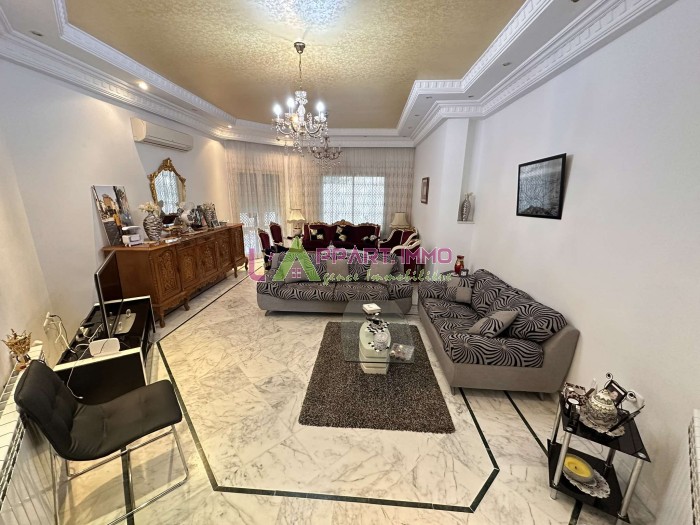 Ce Rez-de-chaussée de villa avec une entrée indépendante se situe dans un quartier calme à Taher Sfar. L'entrée principale ouvre sur un beau jardin gazonné bien entretenu qui entoure la villa offrant un véritable espace de détente. L'entrée donne sur un salon ainsi que d'une salle à manger lumineux grâce à ses baies vitrés qui donnent sur la verdure. La cuisine est aménagée de rangements pratiques et fonctionnels et équipée par une plaque, hotte et four avec accès à un jardin et une salle d'eau pour les invités est disponible. La partie nuit abrite trois spacieuses chambres à coucher partageant une salle de bain. Il est équipé par chauffage central et climatiseurs. Un garage est disponible.