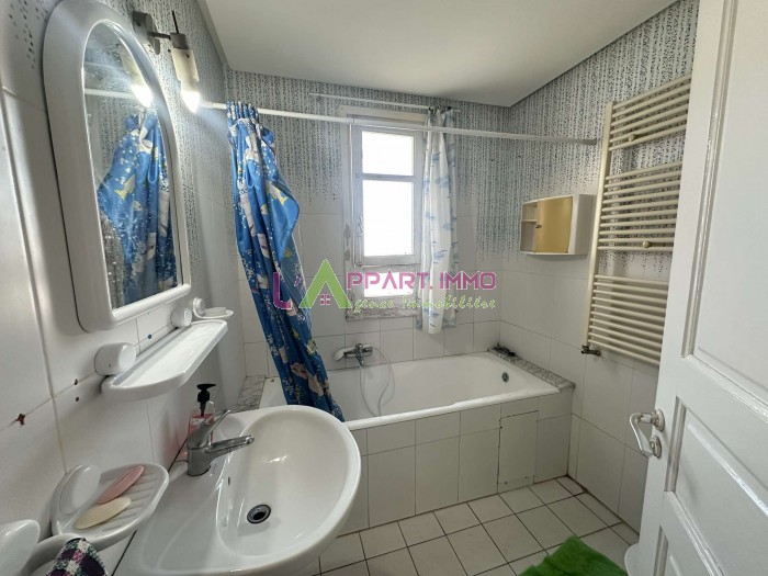 Cet appartement se situe dans une résidence gardée à Nouvelle Madina 3. Il se compose d'un salon avec un balcon, deux chambres à coucher avec placard partageant une salle de bain et une cuisine aménagée avec accès à un séchoir. Il est équipé par un chauffage central. Une place de parking est disponible.