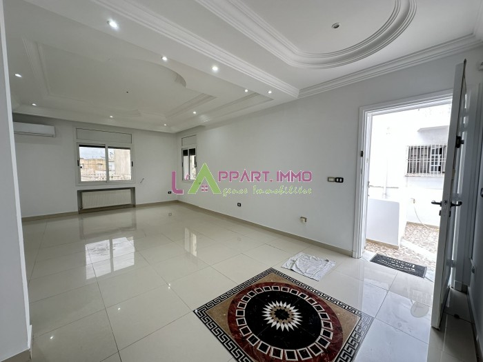 Cet étage de villa se situe dans un quartier calme et propre à Mourouj 3. Il se compose d'un grand salon, trois chambres à coucher partagent une salle de bain et une cuisine aménagée avec accés à une grande terrasse. Une salle d'eau pour les invités est disponible. Il est équipé par cinq climatiseurs et un chauffage central. Un garage est disponible.