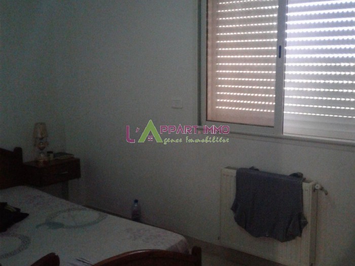 Cet appartement se situe dans une résidence gardée à Borj Cedria. Il se compose d'un salon avec un balcon, deux chambres à coucher dont une avec placard partageant une salle de bain et une cuisine aménagée et équipée avec accès à un séchoir. Chauffage central et une place de parking sont disponibles.